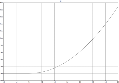 Vto= \(-1,382 \, \text{V}\) - \( I_{DSS} = \text{Beta} \cdot Vto^2 = 9,109\text{m} \cdot (-1,382)^2 \approx 17,4 \, \text{mA}\)