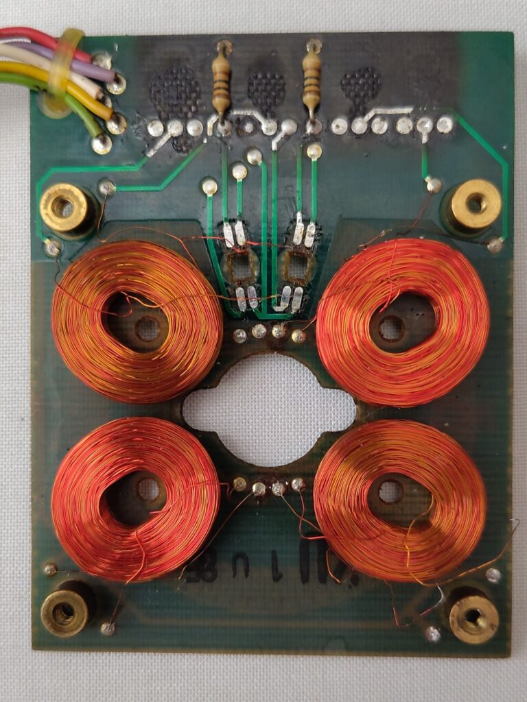 Die Spulen sind bifilar gewickelt, wahrscheinlich mit einem Backlackdraht Durchmesser 0.15 mm. Damit bei der Montage keine Zuordnungsprobleme entstehen, wurden zwei verschiedenfarbige Lackdrähte eingesetzt, Red Coated (red) und Uncolored (unc). Ich lötete also z.B. bei Spule 4 die beiden red - Drähte aus und mass mit einem Ohmmeter den Widerstand. Der normale Widerstand einer Wicklung ist ungefähr 21 Ohm. Von red zu unc gemessen musste er hochohmig sein.