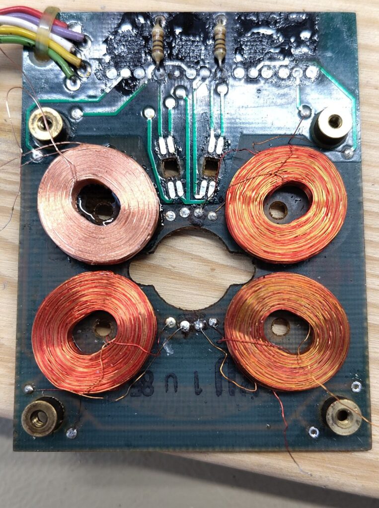 Aber man hörte, dass der Magnet die PCB im Bereich der Delle berührte. Ein Ausbau der Spule oder ein Richten der Platine war nach dem Verkleben nicht mehr möglich. Und noch einmal wärmen wollte ich auch nicht, da die Gefahr bestand, dass die Delle noch grösser wird.